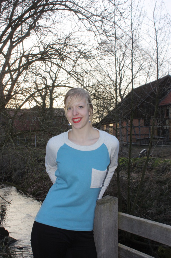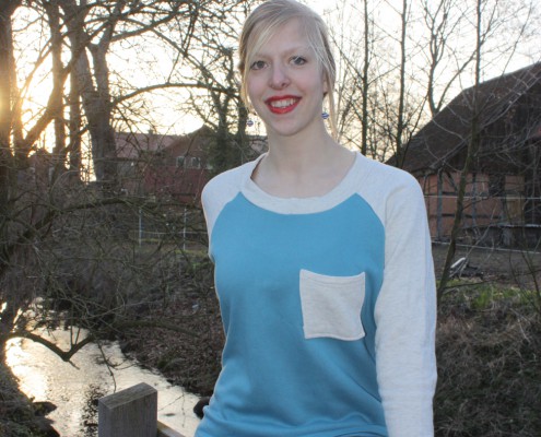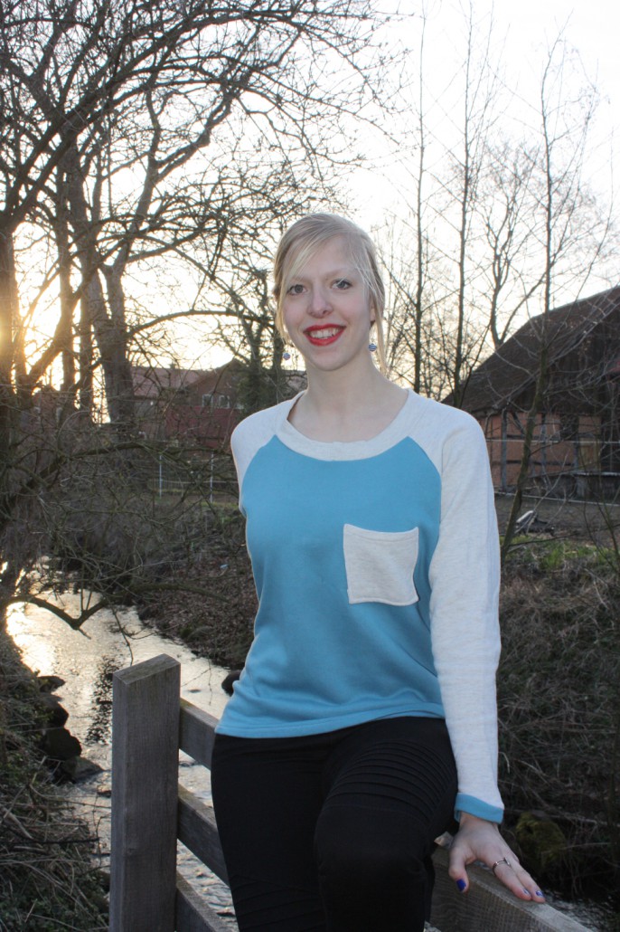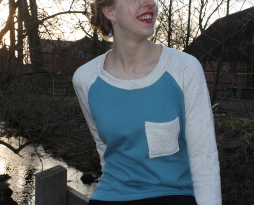 Durch den Luxus einer Overlockmaschine kann man den Pulli ruckzuck nähen, wenn man die Seiten und Ärmel zusammen in einer Naht näht. Damit der Pulli nicht zu schlicht wird habe ich noch eine Dekotasche auf die Brust gesetzt.