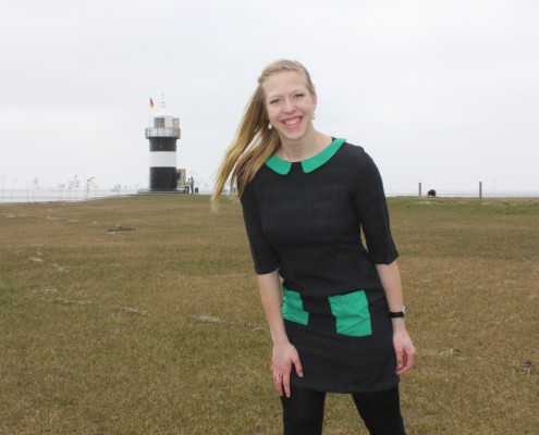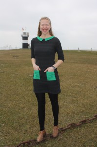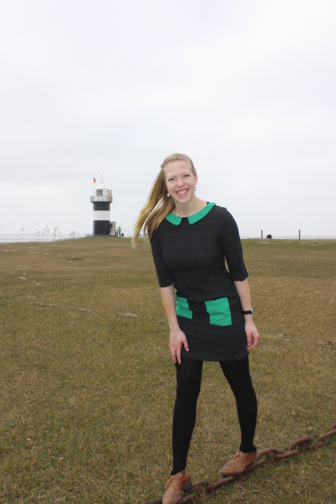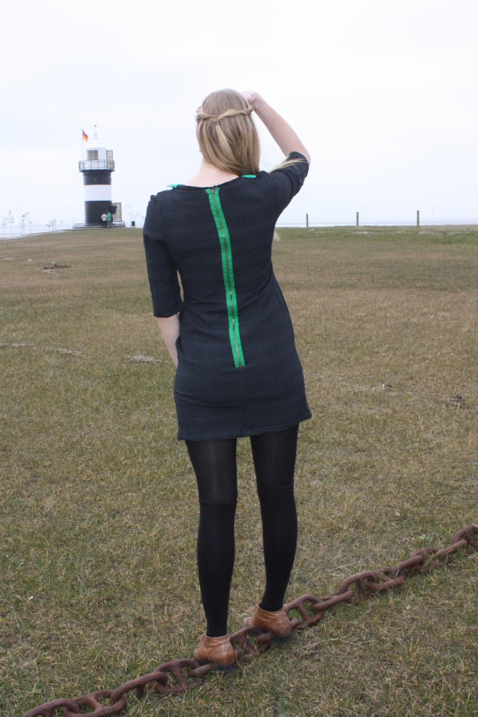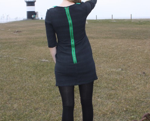 Der Kleider-Schnitt ist gerade und aus einem Anzugstoff. Für Jugendliches Flair haben wir die Kontrastelemente wie Kragen und Taschen in frischem Grün gewählt und den Reißverschluss von außen aufgesteppt.