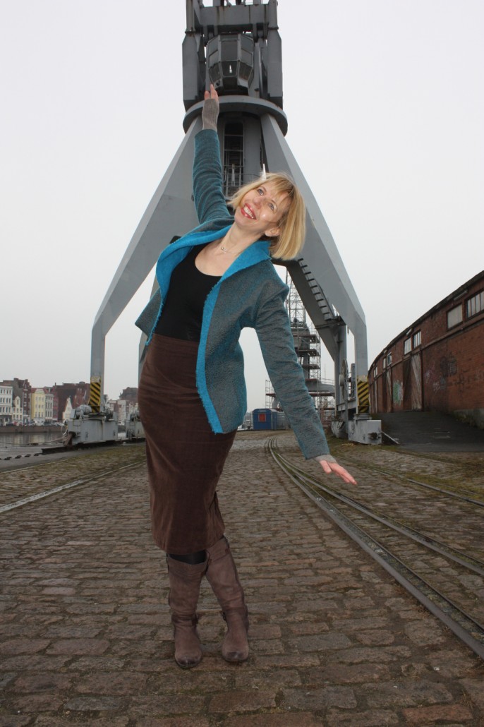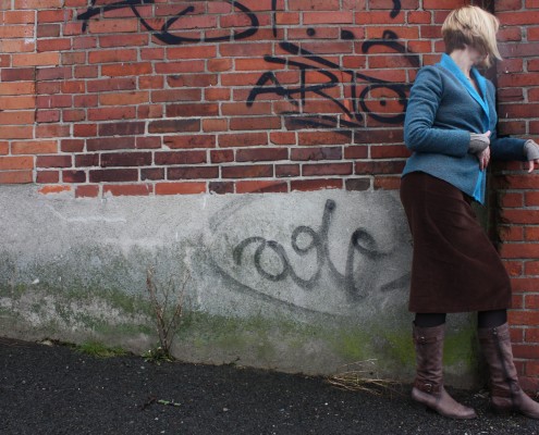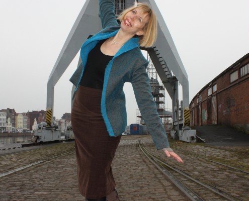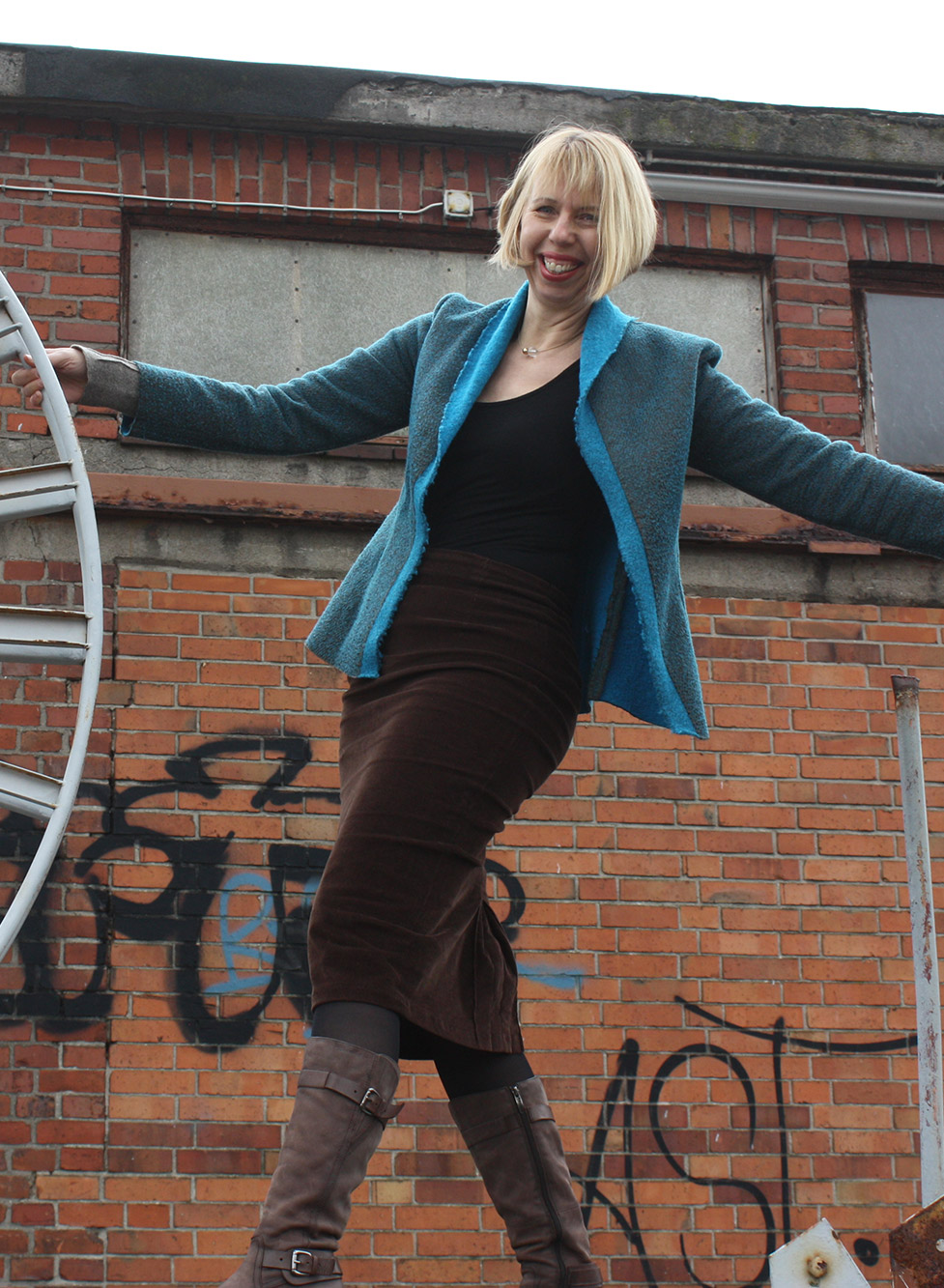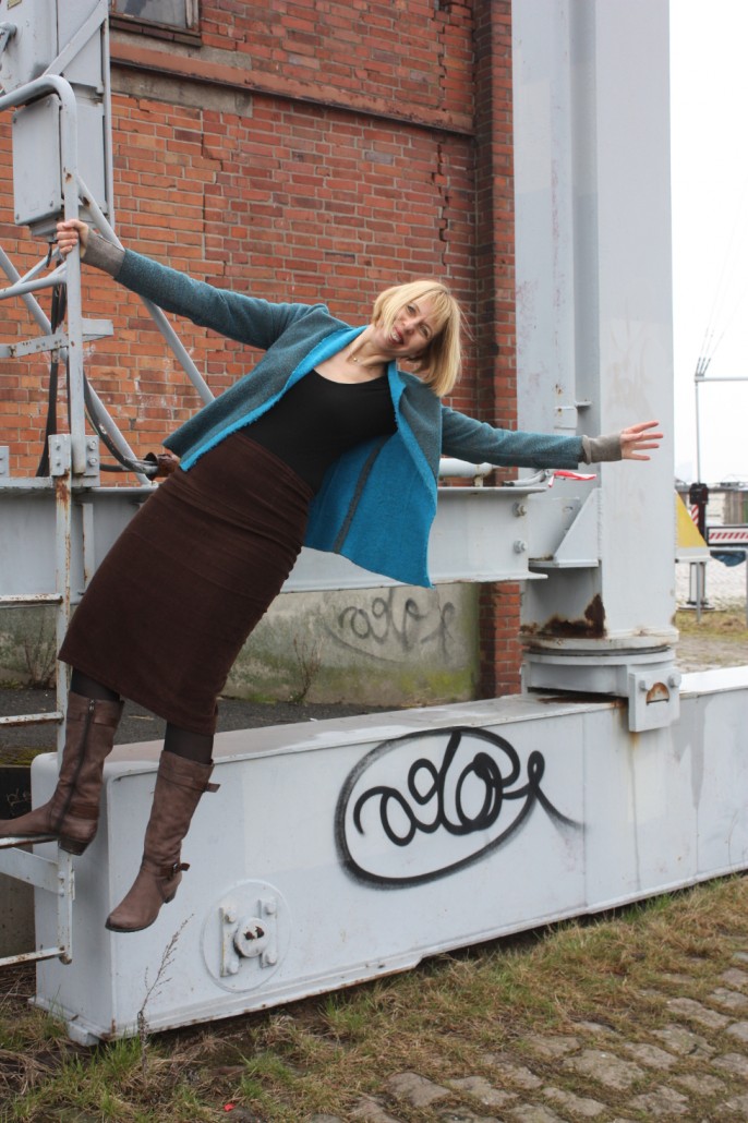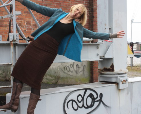 Die kuschelige Wollwalkjacke ist aus einem grünen Walkstoff in den ein brauner Seidenstoff eingewirkt wurde. Sieht superedel aus. Ich habe die einfarbige Webkante ganz bewusst beim Zuschneiden so verwendet, so dass eine wunderbare Kontrastkante entsteht.